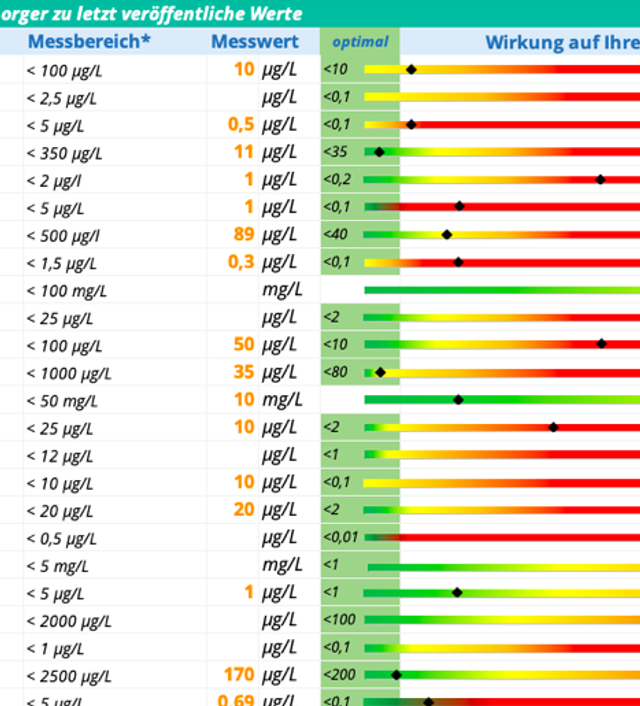 Die getesteten Werte werden mit den gemessenen Werten des Wasserwerks verglichen und in eine gesundheitliche Auswertung, aus der Erfahrung von Therapeuten, Heilpraktikern und Ärzten gebracht. Also verständlich über eine Farbskala (grün zu Rot), nicht einfach nur einen Wert (wie vom Wasserwerk) mit dem die meisten nichts anfangen können.